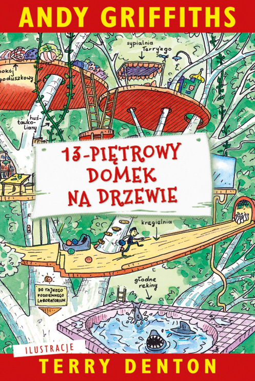 Andy i Terry mieszkają w trzynastopiętrowym domku na drzewie. A ten domek jest najfajniejszy na świecie! Znajdziecie tu kręgielnię, oczko wodne pełne rekinów, tajne podziemne laboratorium oraz inteligentny piankomat, który podąża za człowiekiem krok w krok. Naprawdę, życie byłoby piękne, gdyby nie to, że dwaj kumple mają jeden dzień na napisanie nowej książki dla swojego wydawcy, Nochalskiej Księgarni… W dodatku ciągle coś im przeszkadza: latające koty, gigagoryle, milutkie syrenki, potwory morskie udające milutkie syrenki… Domek na drzewie po prostu pęka w szwach od niezapowiedzianych gości! No, na co czekacie? Właźcie!
